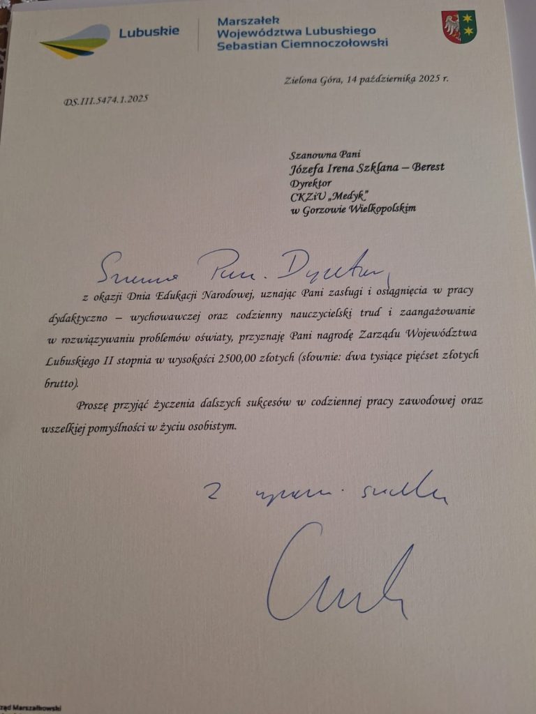 24 października 2025 r. w Regionalnym Centrum Animacji Kultury w Zielonej Górze odbyła się uroczystość z okazji Dnia Edukacji Narodowej. Nagrody Zarządu Województwa Lubuskiego, dyrektorom placówek i nauczycielom wręczyła Anna Chinalska – Członkini Zarządu Województwa Lubuskiego.